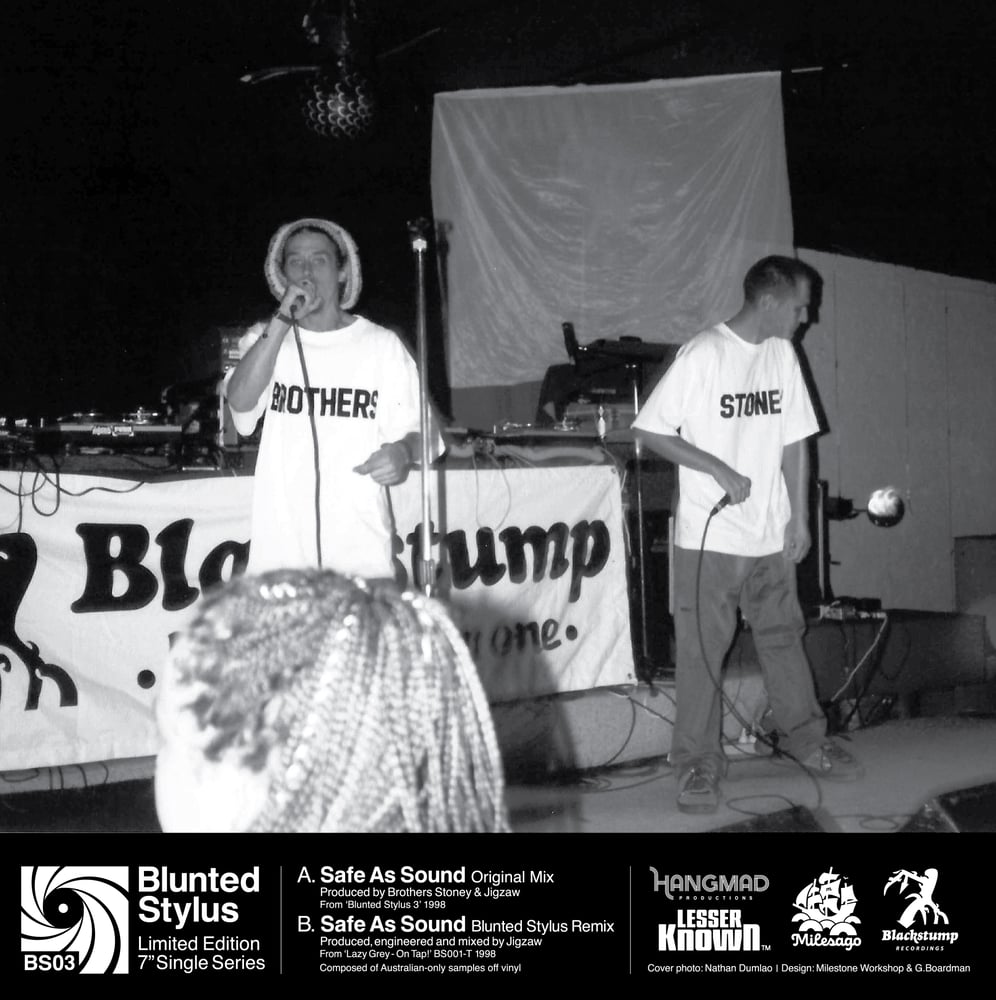 The BLUNTED STYLUS 7" Single Series just gets stronger, with another two certified classics back-to-back, professionally packaged in a striking "Safe-As" picture sleeve. Lazy Grey and Len-One are pictured on the back cover performing at "The ZOO" launch night Brisbane. (photograph by G. Boardman).